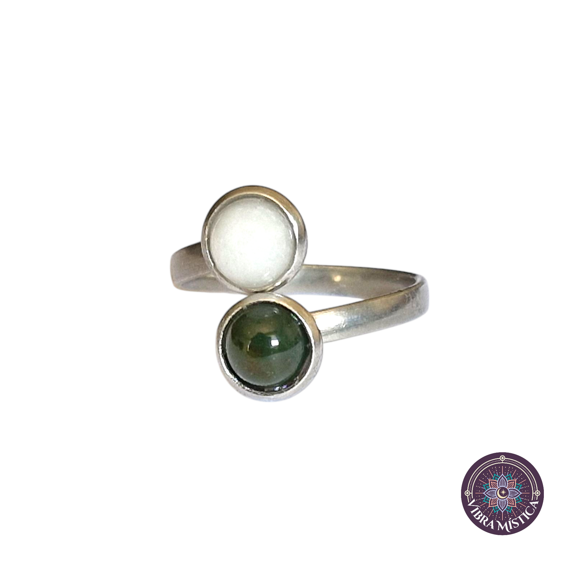 Luce la elegancia y la energía positiva con este hermoso anillo artesanal de diseño abierto, elaborado en metal plateado y engastado con cabujones de Turquesa blanca y Ágata India.