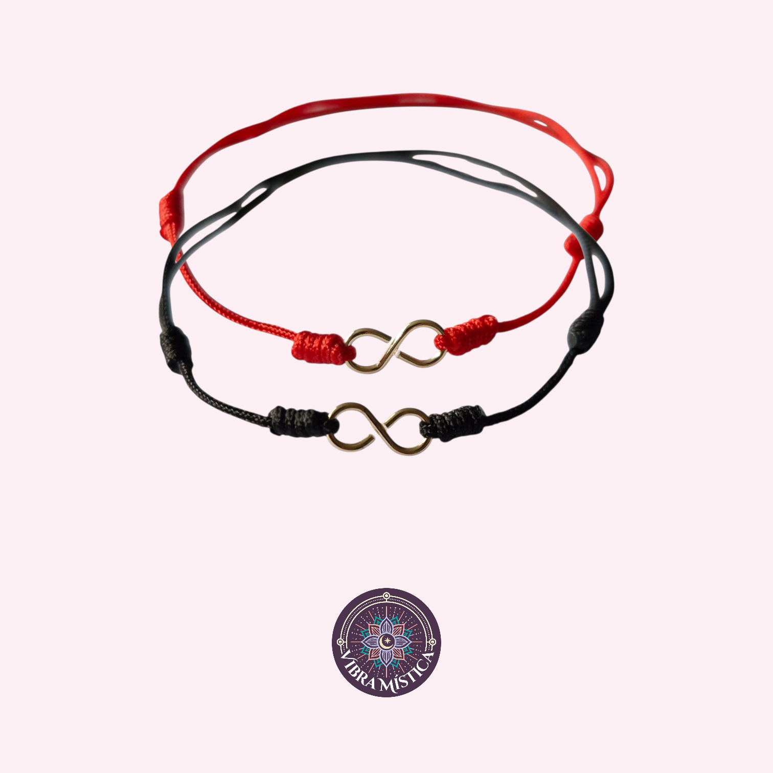 Un dúo de energía complementaria: rojo para la pasión y protección, negro para la fuerza y el misterio. Cada pulsera lleva el símbolo del infinito, recordando que los lazos verdaderos no tienen fin.